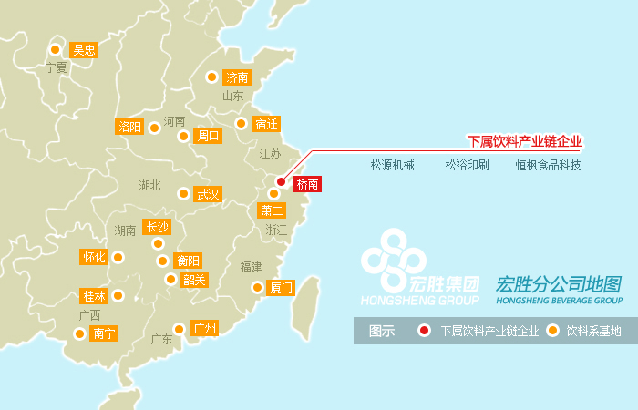 宏勝集團(tuán)擁有20多年的生產(chǎn)經(jīng)驗(yàn),以及全球領(lǐng)先的自動(dòng)化生產(chǎn)線,參與國際競爭,承接各類飲料OEM業(yè)務(wù)。共有飲料系企業(yè)36家,分布杭州、長沙、武漢、濟(jì)南、廣州等16個(gè)基地。 生產(chǎn)基地:布局全國,產(chǎn)地直銷 組建六大區(qū)域,整合區(qū)域內(nèi)的生產(chǎn)、物流、人員、銷售,提高市場反應(yīng)靈活性。遍布全國的生產(chǎn)基地、實(shí)現(xiàn)500公里半徑市場覆蓋。