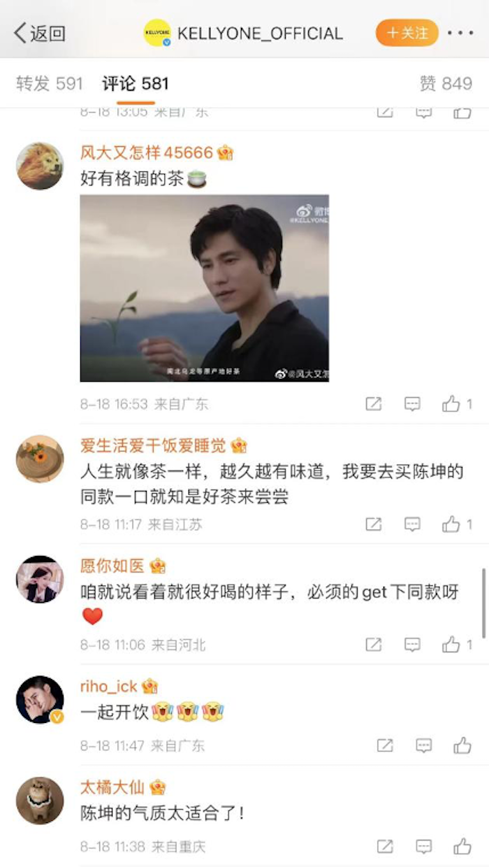 8月18日,KELLYONE在官方微博宣布演員陳坤為其一茶全系列全球代言人。KELLYONE與代言人陳坤同步宣發(fā)TVC,以自然純粹的風(fēng)格,傳達“一口就知是好茶”的品牌理念。