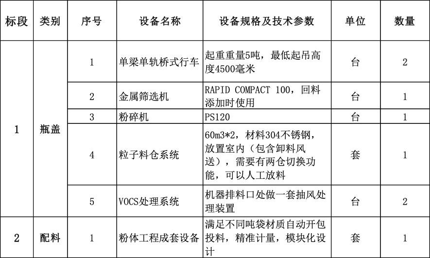 本次宏勝飲料集團(tuán)杭州蕭山智能化工廠項(xiàng)目瓶蓋與配料標(biāo)段設(shè)備需求見下表,內(nèi)容包括設(shè)備供應(yīng)、指導(dǎo)安裝調(diào)試和售后服務(wù)等。詳細(xì)需求待報(bào)名且審核通過后與相應(yīng)技術(shù)部門對(duì)接。